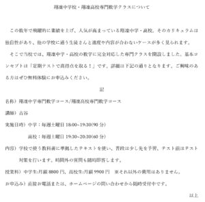 そこで当校では、翔凜中学・高校の数学に完全対応した専門クラスを開設しました。基本コンセプトは「定期テストで高得点を取る!」です。詳細は下記の通りとなります。ご興味のある方はぜひ無料体験にお申込みください。